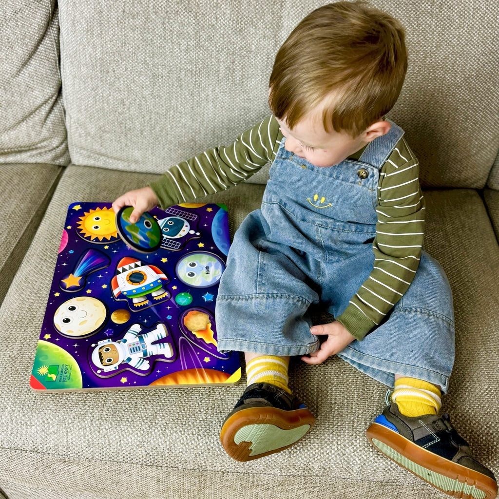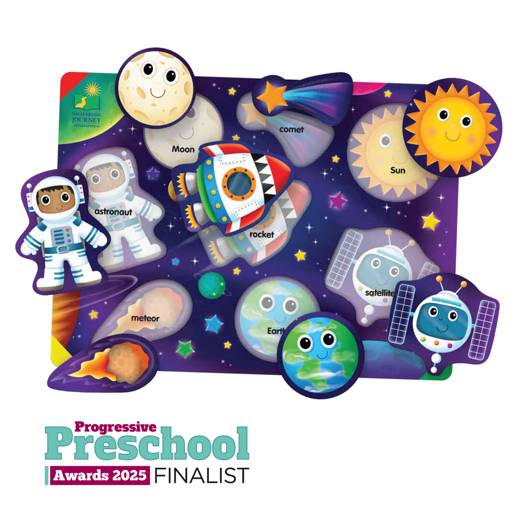 Little explorers can explore Space - the fun & colourful lift & learn puzzle consists of 8 pieces to teach about space objects. Brightly coloured objects make it interesting for little ones to find homes for each puzzle piece and the raised textures make it easy to grab for little hands.
