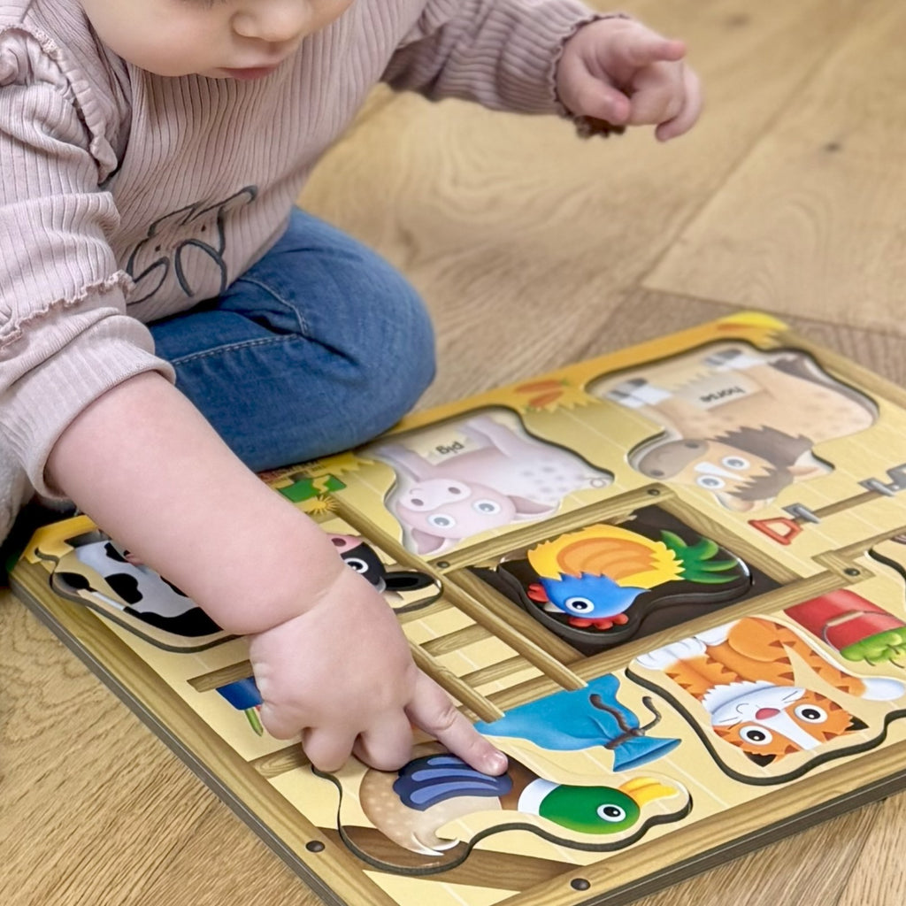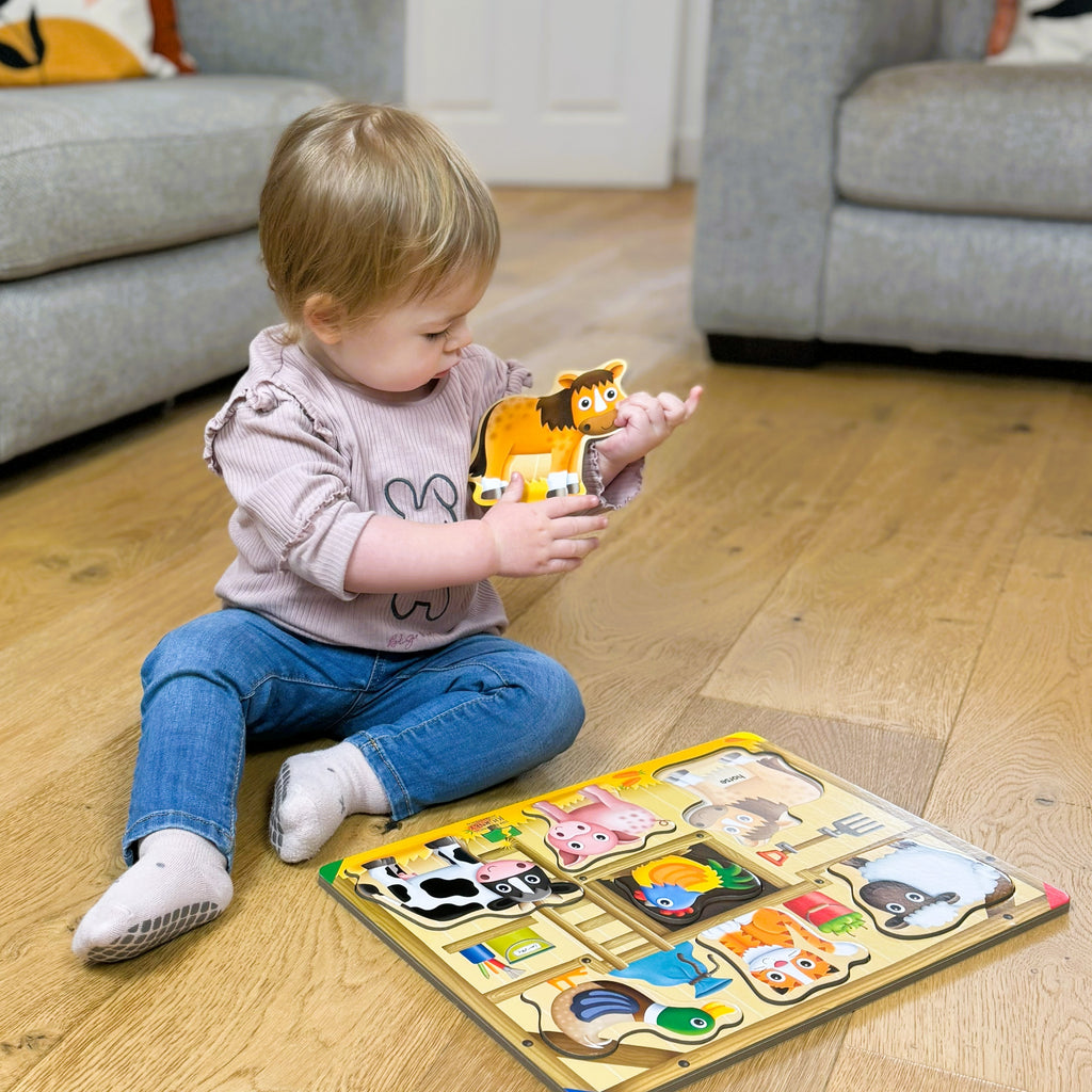 My First Lift & Learn – On The Farm - consists of 7 pieces to teach about farmyard animals. Brightly coloured objects make it interesting for little ones to find homes for each puzzle piece and the raised textures make it easy to grab for little hands.