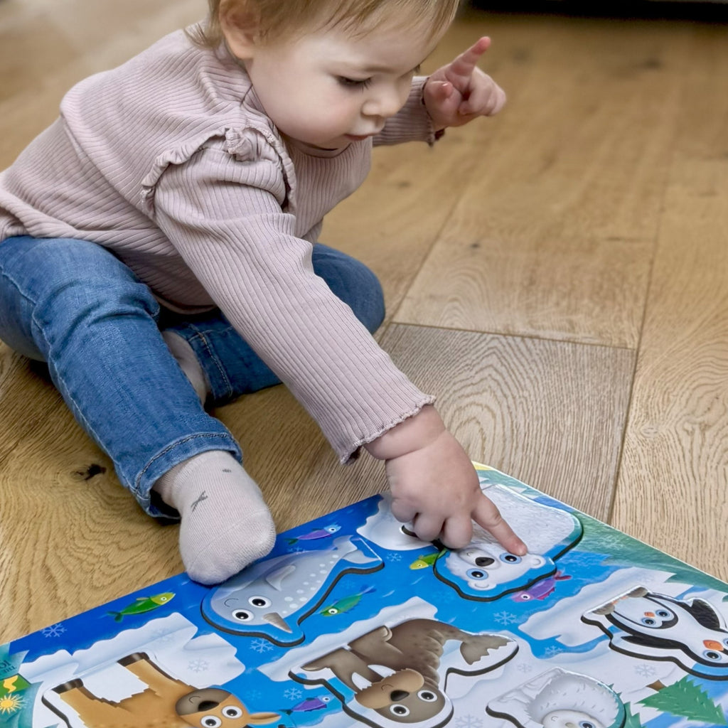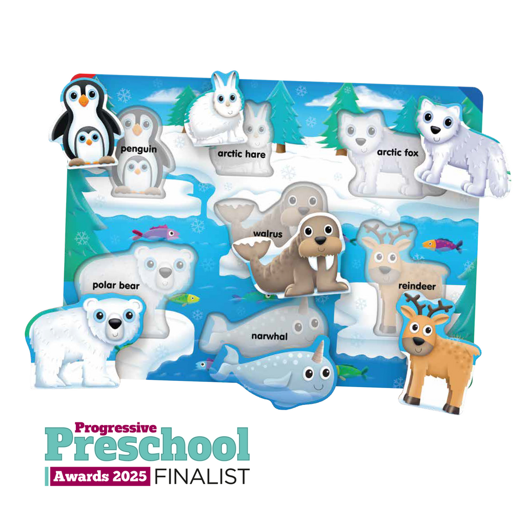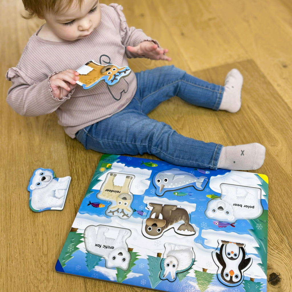 Little explorers can explore the artic world with this chunky puzzle full of arctic creatures. My First Lift & Learn – Arctic consists of 7 pieces to teach little ones all about the Arctic. Brightly coloured objects make it interesting for little ones to find homes for each puzzle piece and the raised textures make it easy to grab for little hands.