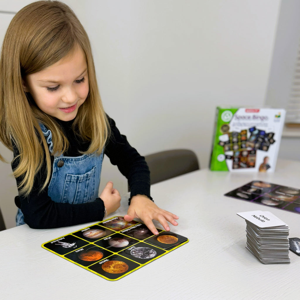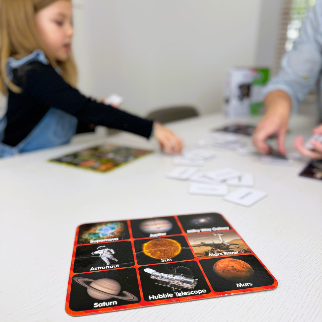 Match It! Bingo - Space is designed to assist young children with object and word recognition and is perfect for beginning readers. By matching the picture word cards on the playing boards, children will enjoy valuable learning experiences in a fun and easy way. Match It! Bingo - Space includes four double sided game boards, 36 picture word cards and suggestions for different ways to play the game. For two to four players. The Match It series features a wide range of award-winning educational titles. Match It! games are a terrific learning tool for everyone. Recommended for ages three and up.